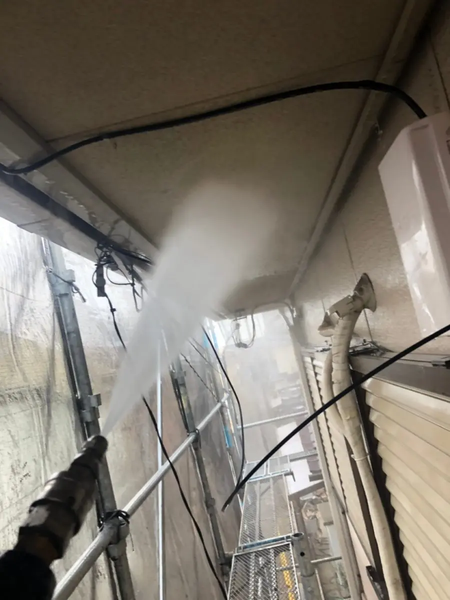 建物をキレイにする為、強力な水圧で汚れなどの不純物を除去しました。
